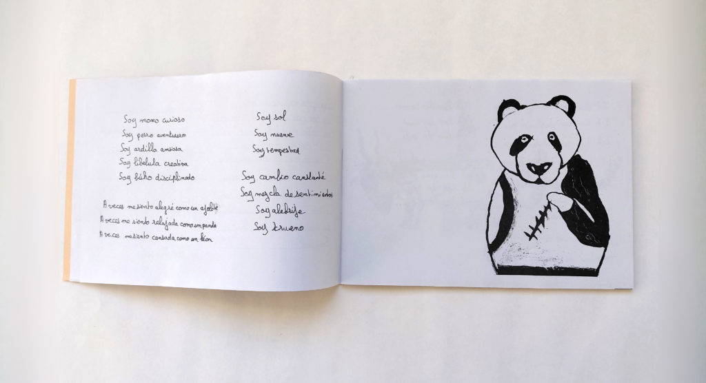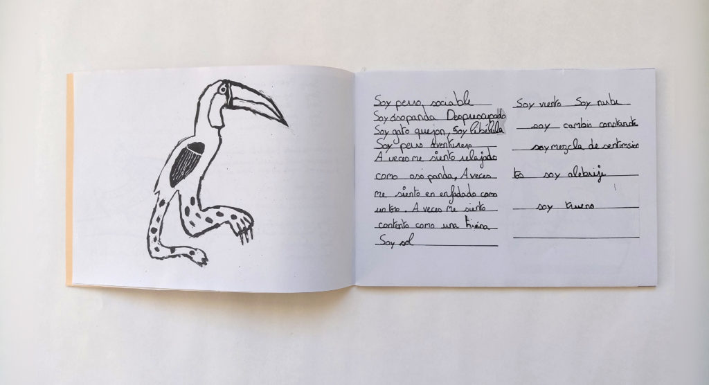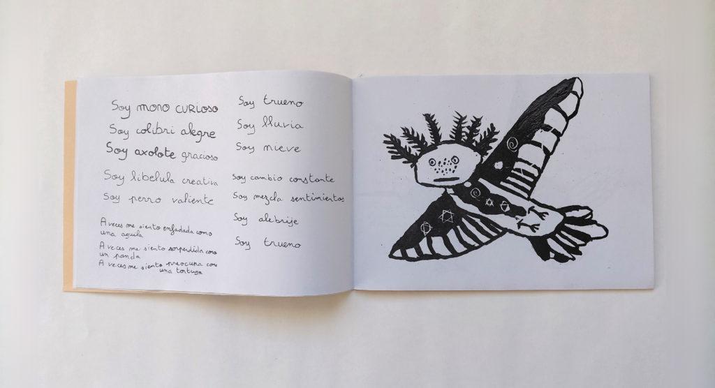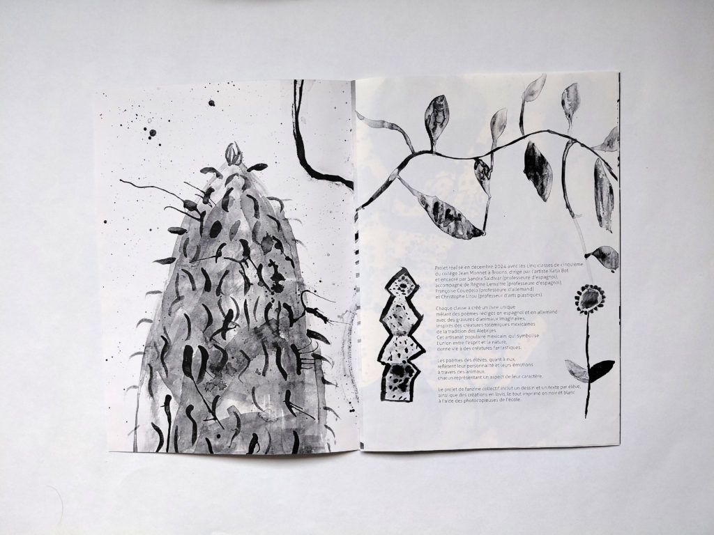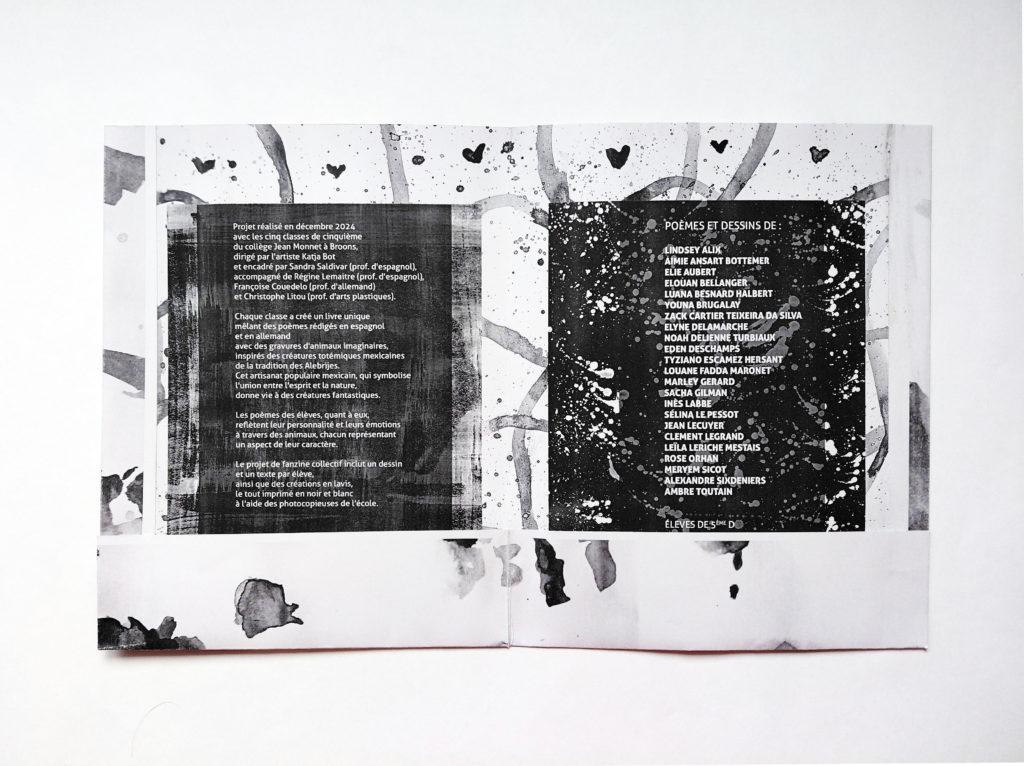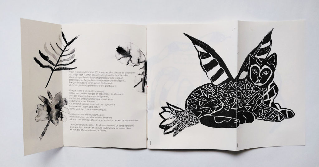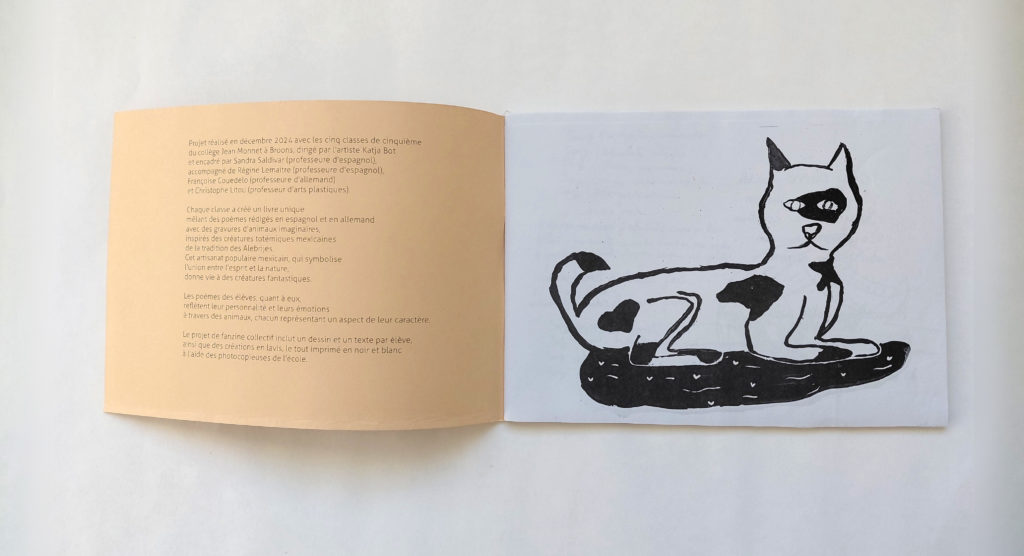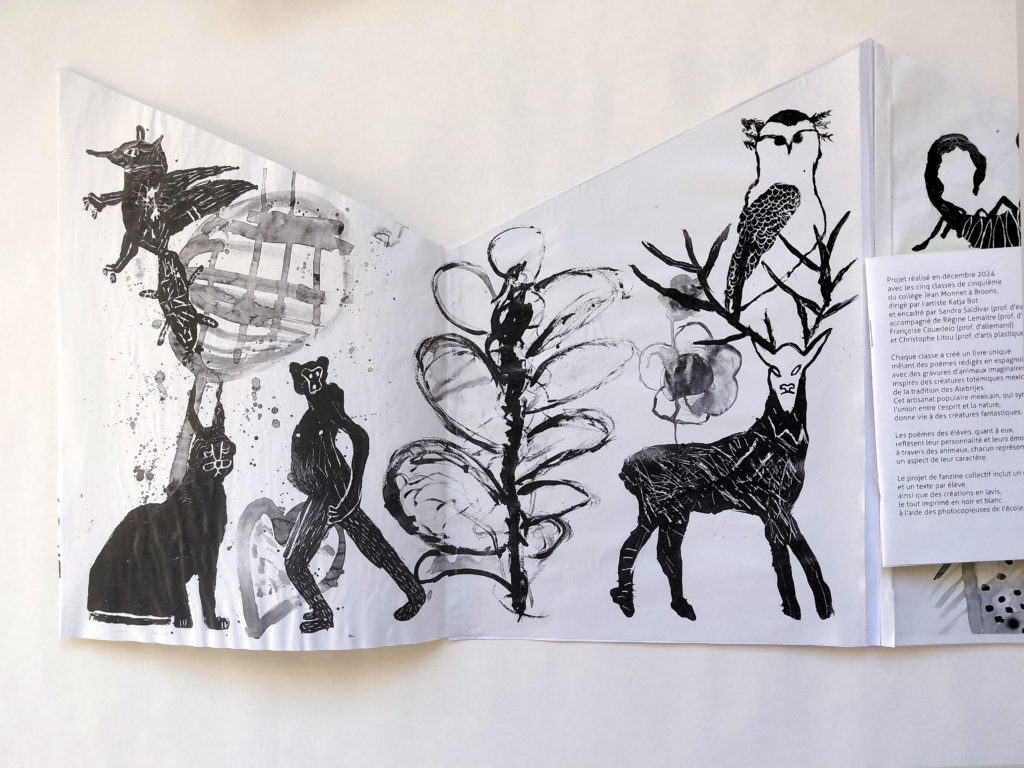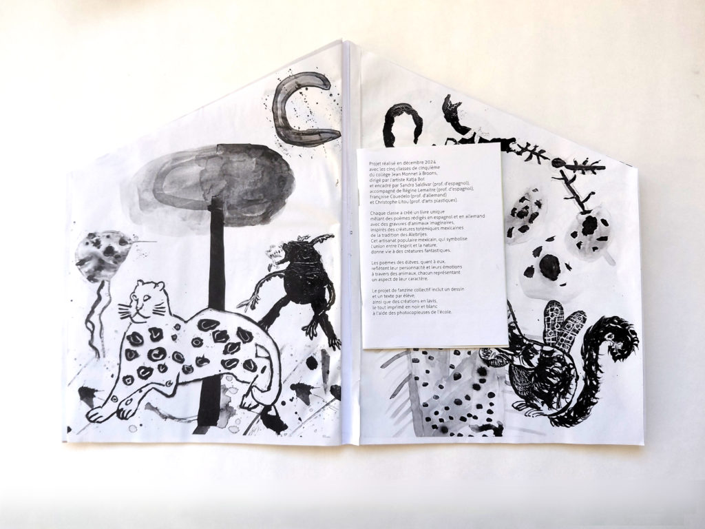 Chaque classe a créé un livre unique, mêlant des poèmes rédigés en espagnol et en allemand avec des gravures d’animaux imaginaires inspirés des créatures totémiques mexicaines de la tradition des Alebrijes. Il symbolise l’union entre l’esprit et la nature et donne vie à des créatures fantastiques. Les poèmes des élèves, quant à eux, expriment leur personnalité et leurs émotions à travers des animaux, chacun représentant un aspect de leur caractère.