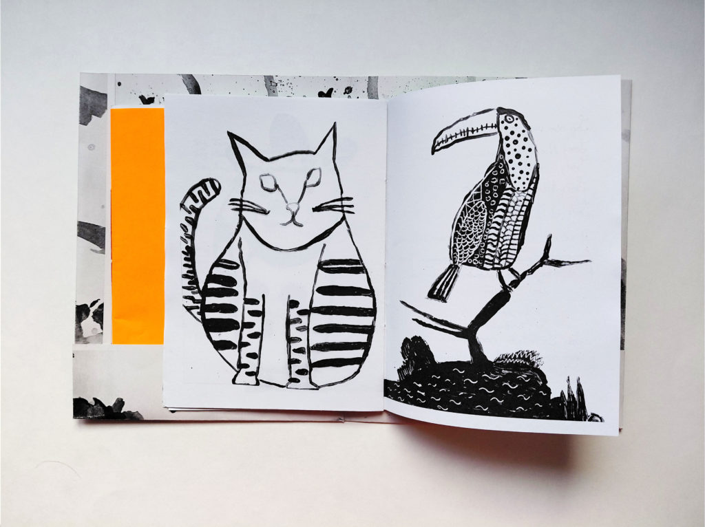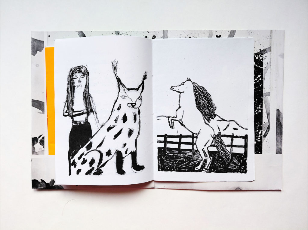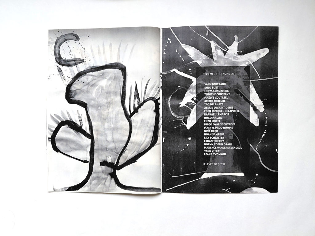 Chaque fanzine comprend un dessin et un texte par élève, ainsi que des créations en lavis, le tout imprimé en noir et blanc à l’aide des photocopieuses de l’école.