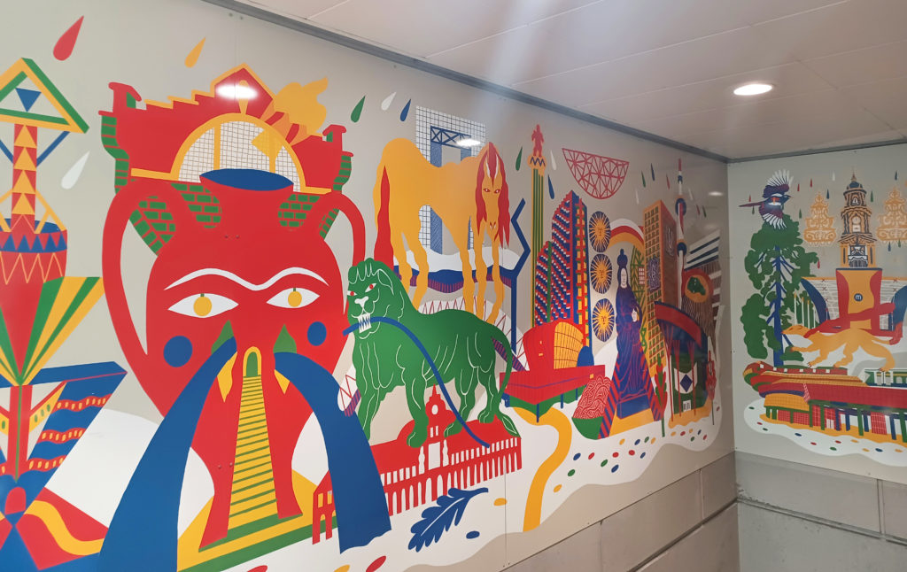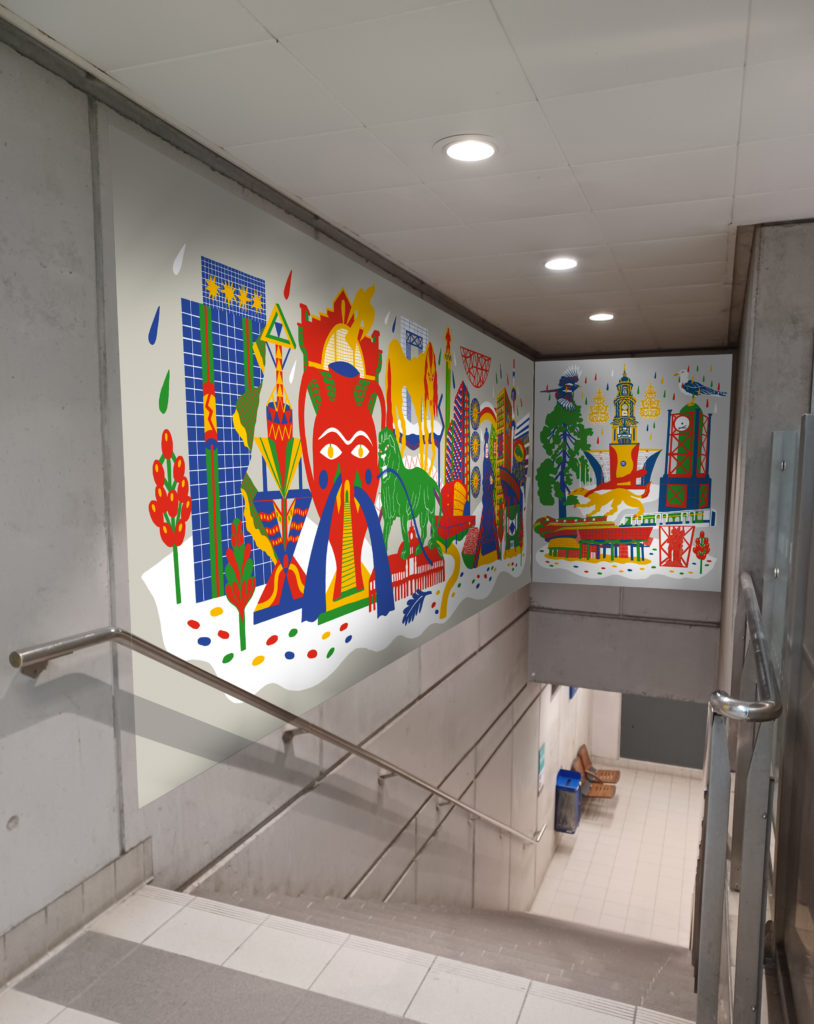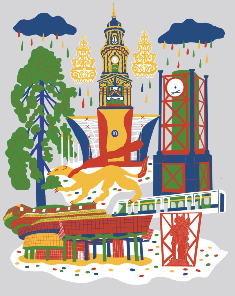 Une lecture de la ville, entre repères réels et formes symboliques. Les stations de la ligne A sont représentées par une figure, parfois inspirée d’un bâtiment existant, parfois issue de l’imaginaire. Les couleurs sont celles de la signalétique du réseau de métro rennais.