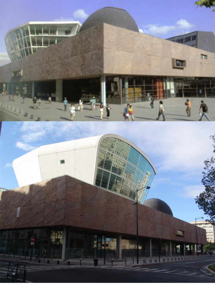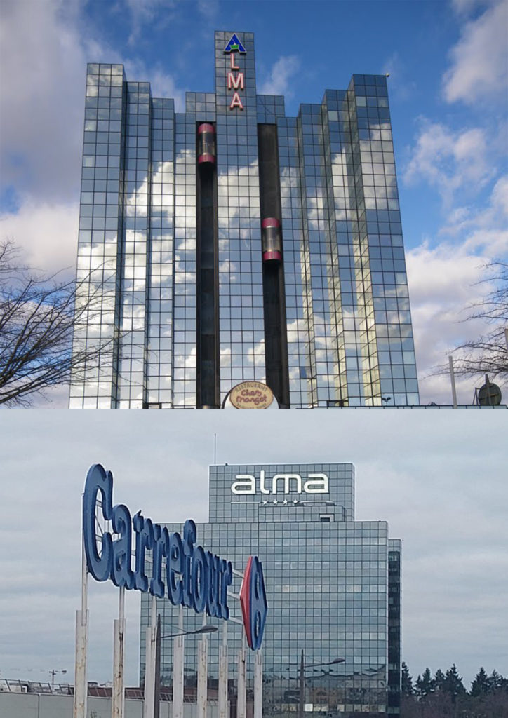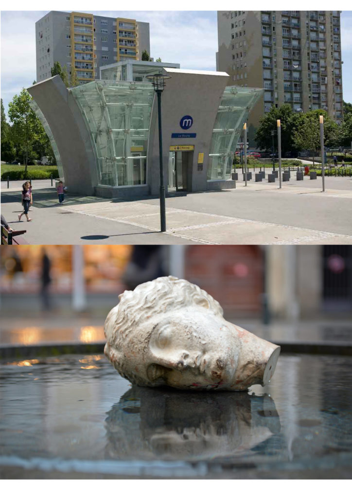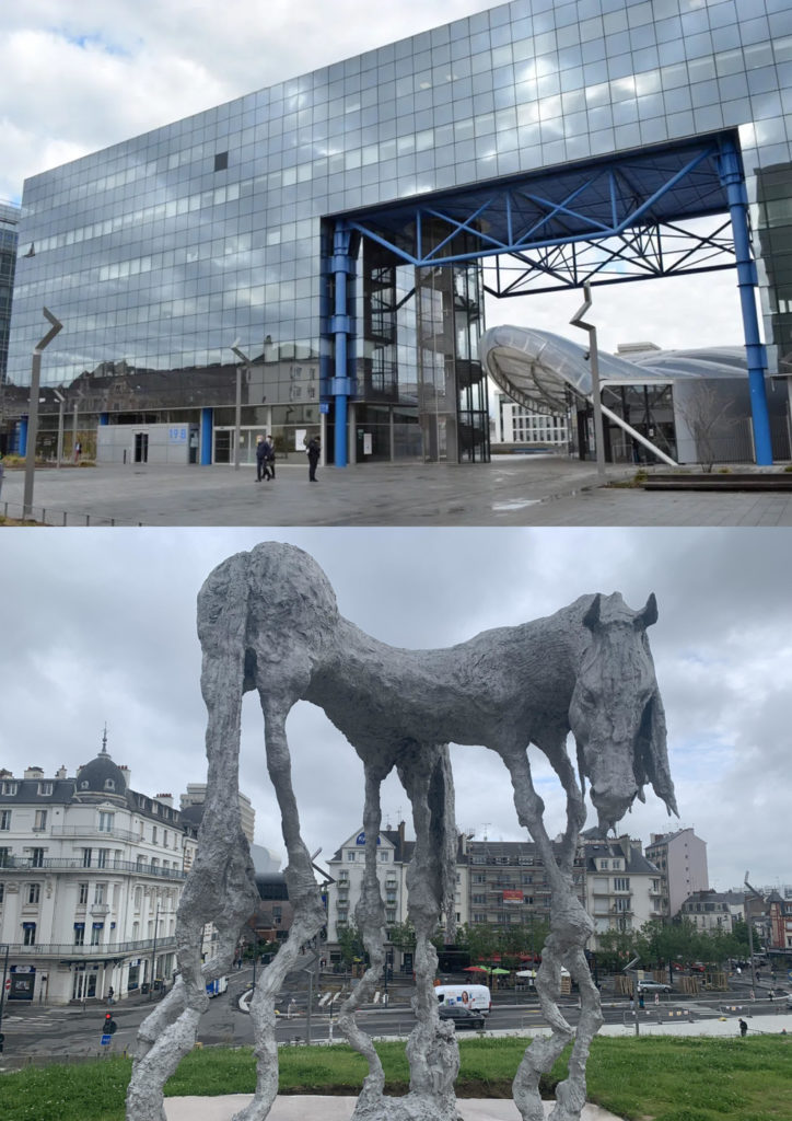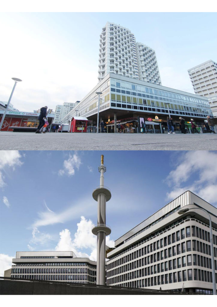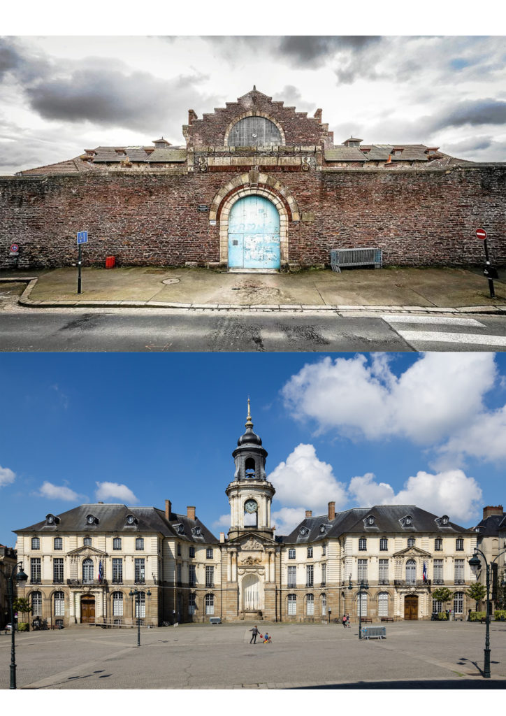 De gauche à droite : Le centre Alma, la station Triangle, l’ancienne prison Jacques-Cartier, la station La Poterie, la sculpture du cheval de l’artiste Jean-Marie Appriou place de la Gare avec son grand bâtiment atypique en fond, le lion symbole de la République et son Palais du Commerce, les bâtiments de la Dalle Colombier, la tour King Kong de la fête foraine place du Champ de Mars, le centre commercial atypique Les Trois Soleils, les Champs Libres, la station Italie, le centre culturel Le Triangle, la station Saint-Anne avec ses bâtiments en pan de bois, les immeubles de la Dalle Kennedy, la tour Mabillais, Hygie la tête coupée place de Coëtquen et l’entrée de l’université Rennes 2.